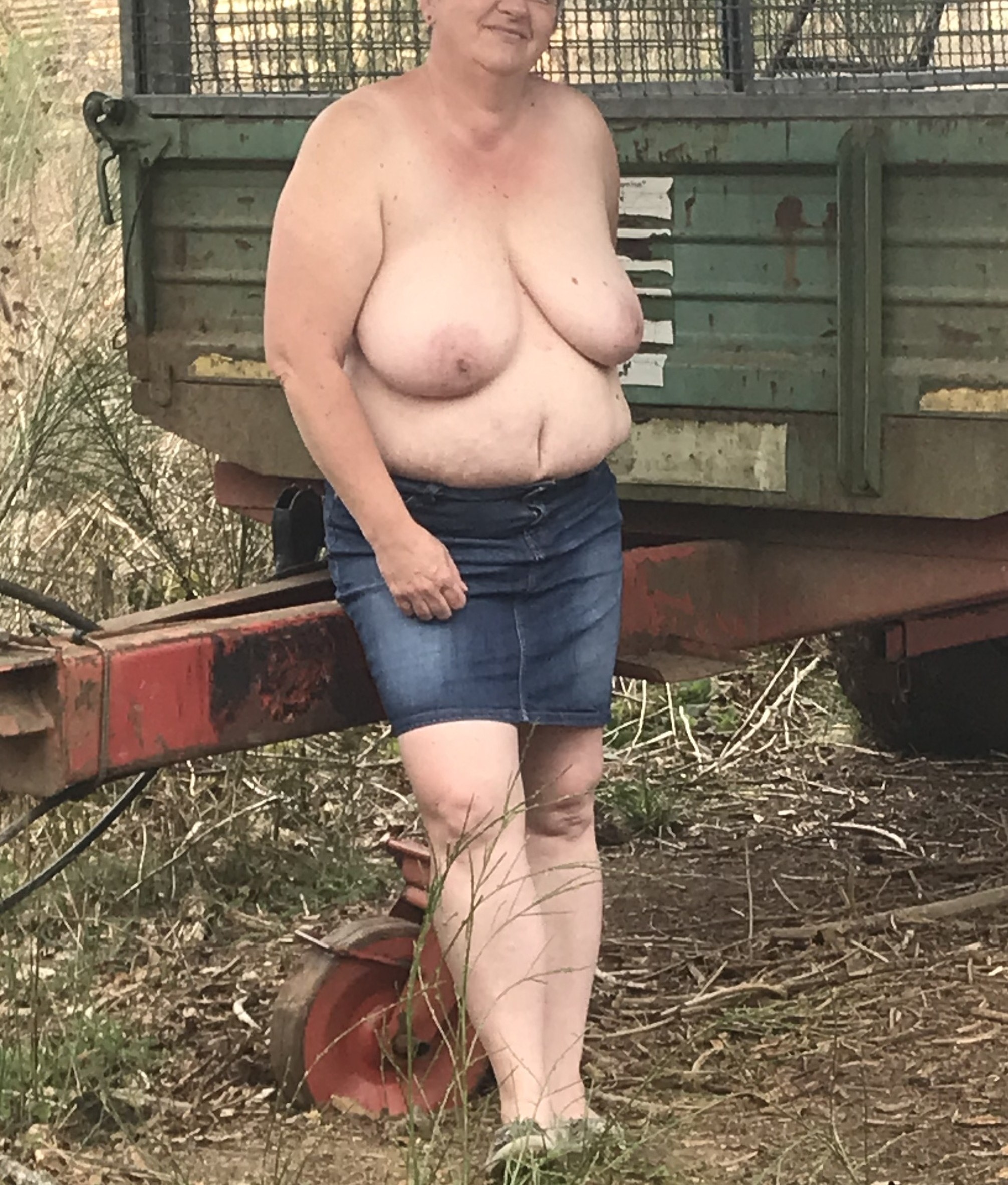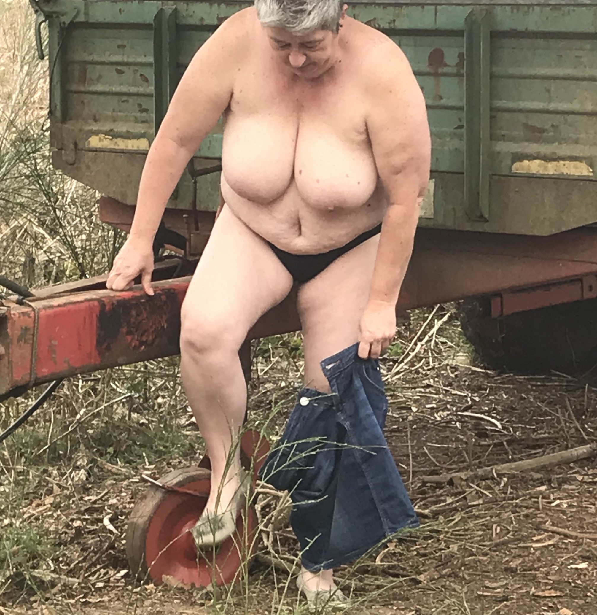 Dicke Frau nackt im Wald.Schön blank gezogen und die Hängeeuter baumeln lassen.